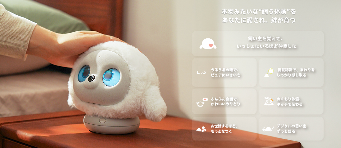 自宅やオフィスで、気軽に迎えられるAIペットです。そばにいるだけで心がふっとほどけ、孤独感や不安がやわらぐ——そんな“寄り添い”を目指しています。 住環境や体質、ライフスタイルの事情で本物のペットを迎えられない方にも、無理なく続く相棒として長く寄り添います。